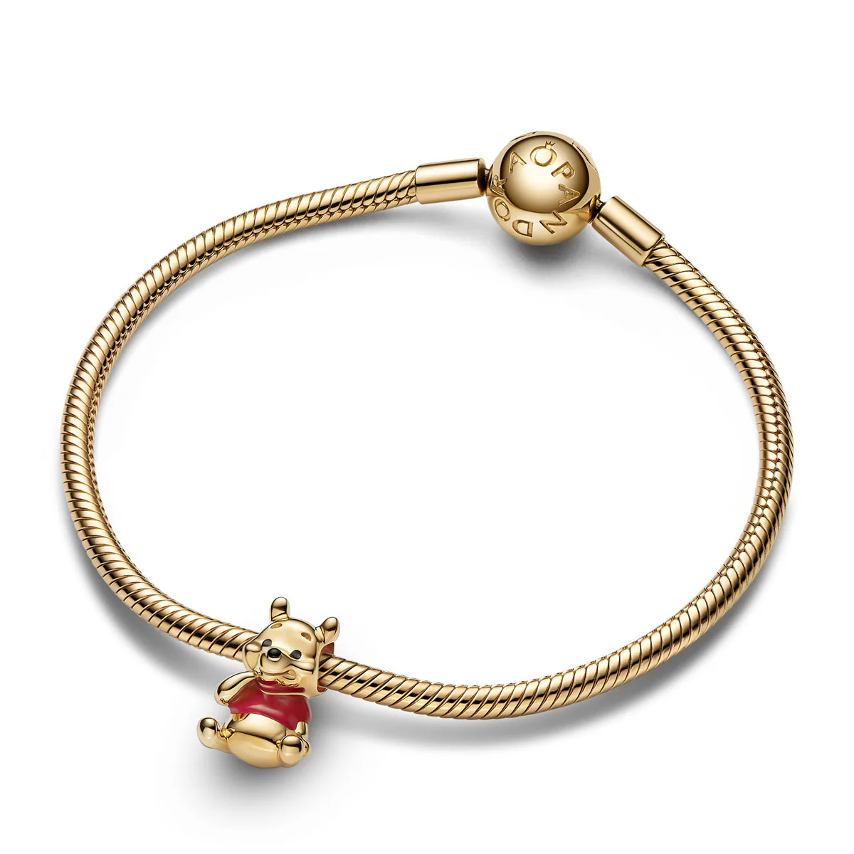 Time for something sweet! The 14k gold-plated Disney's Winnie the Pooh Bear Charm features the much-loved Winnie the Pooh character in a seated pose with his paw raised ready to eat some delicious honey. The lovable bear wears a T-shirt colored with red enamel, and black enamel details bring his cheerful expression to life. Add Winnie the Pooh and friends to your bracelet or charm holder and reignite your favorite memories of moments spent with friends.