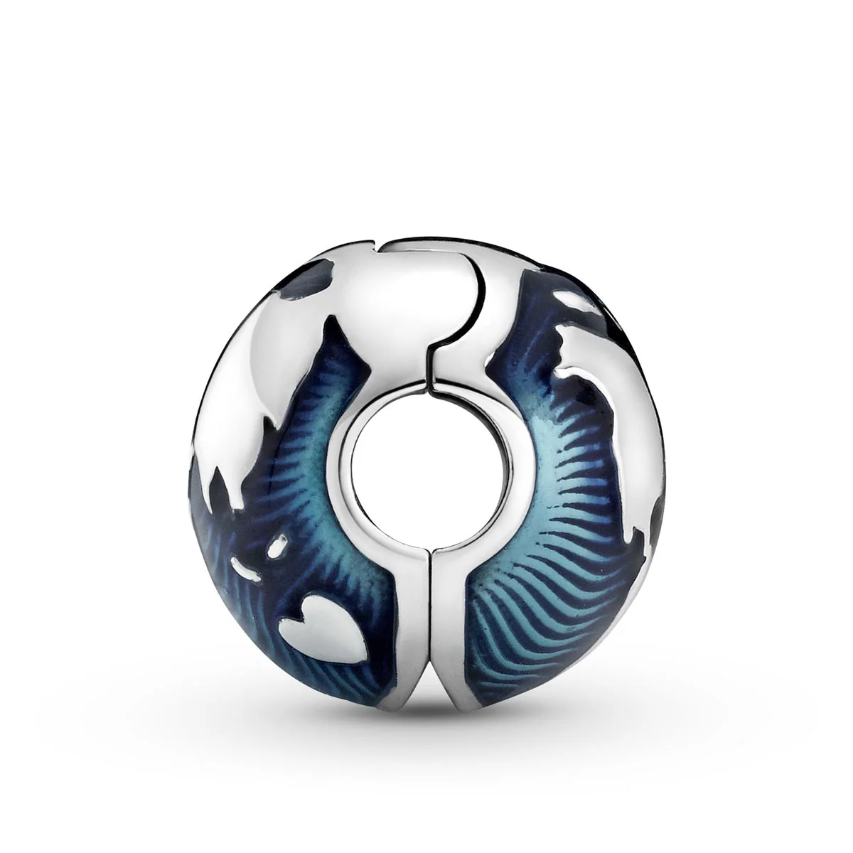 Express your love for our world with the Blue Globe Clip Charm. Polished sterling silver continents are surrounded by hand-applied blue enamel waves and Australia is shaped as a heart. Wear it as a reminder of future and past travels and pair it with other blue Pandora Moments charms as a tribute to our blue planet. This clip charm features no silicone grip, so it will slide if not styled onto threads (two raised charm dividers).