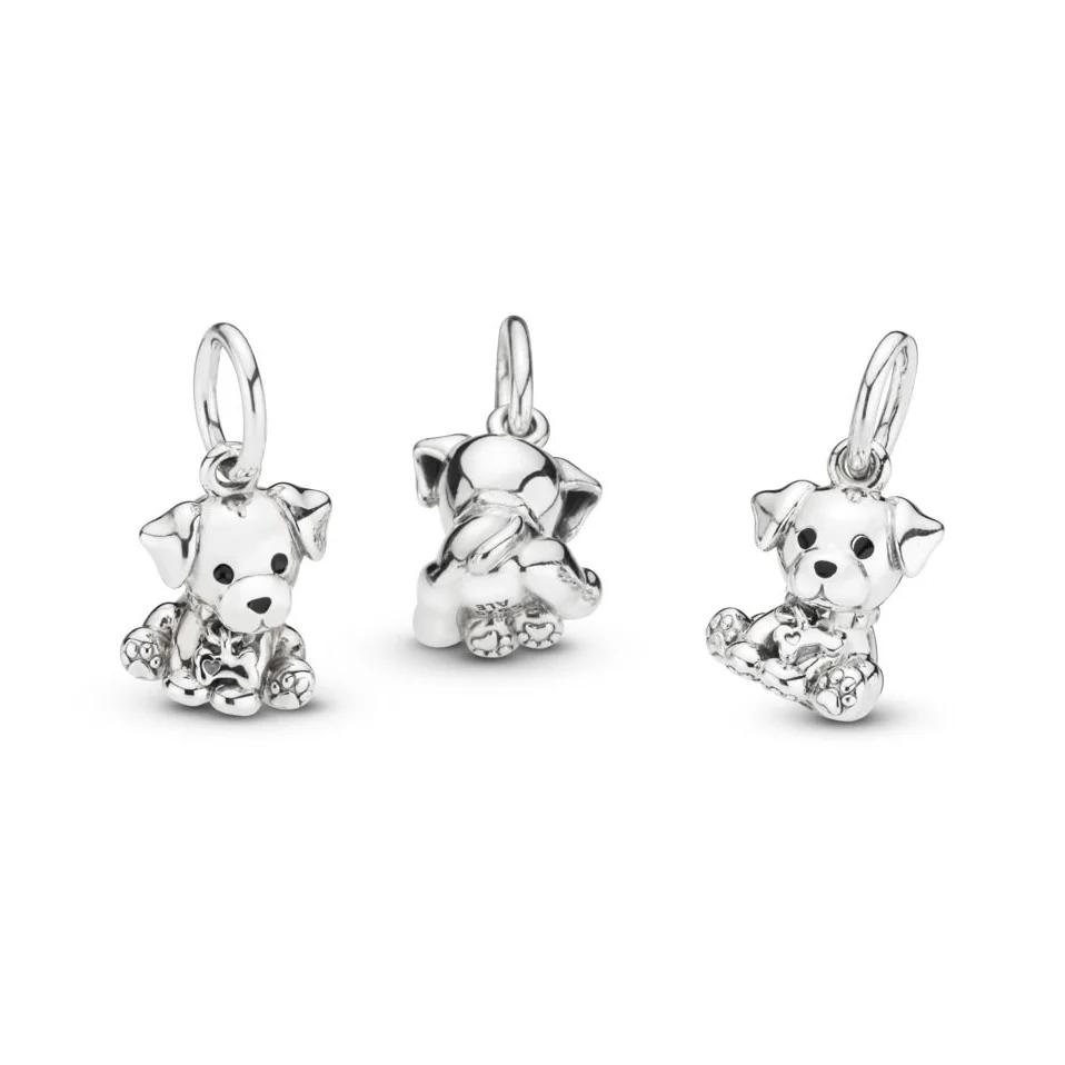 Make your favorite pet a part of your style with this labrador puppy charm. The adorable sterling silver design wears a dangling bone-shaped collar detailed with enamel, and its paws are embossed with pretty hearts.