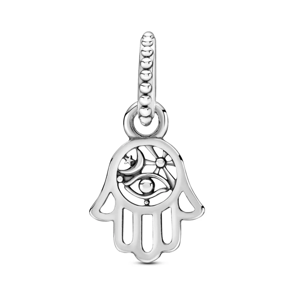 Always channel positive vibes with the Protective Hamsa Hand Dangle Charm. Hand-finished in sterling silver, this Hamsa charm features an intricate openwork design and hangs from a beaded bail. An eye, rays and crescent moon motifs feature inside the hand, which includes beading along its outline as a reference to signature Pandora design. A talisman to defend against evil, the dangling hand is seen as a gesture of welcoming an abundance of goodness, kindness, friendship and grace into your life.