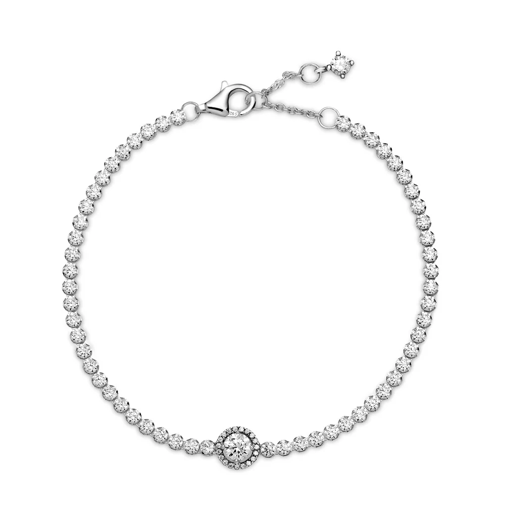 Level up your outfit with the Sparkling Halo Tennis Bracelet. Hand-finished in sterling silver, this shimmering piece is decorated with sparkling stones. The centrepiece features a big central stone surrounded by a halo of clear cubic zirconia. Thereās a small stone detail at the end of the chain for added sparkle. This tennis bracelet includes a lobster clasp for safe closure. Style with other shimmering Pandora Timeless pieces for a classic look that stands out.