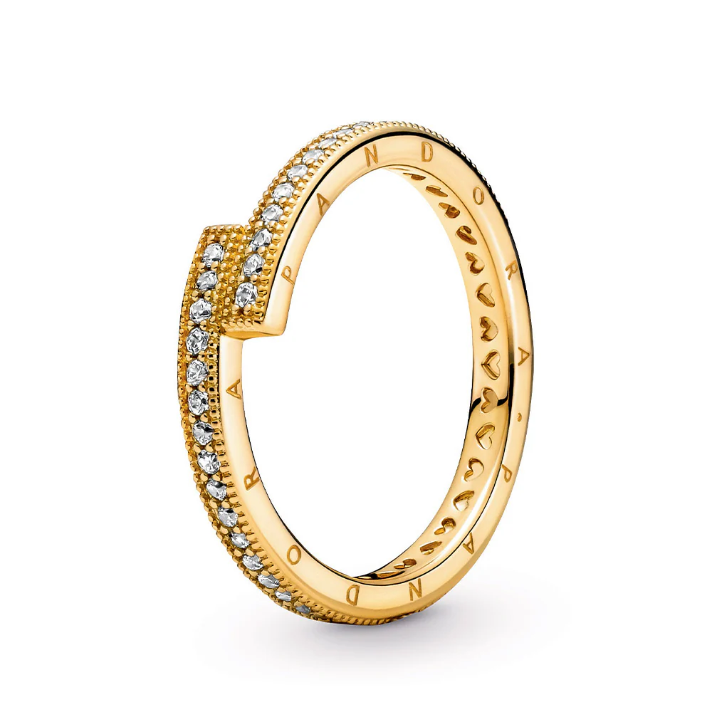 Opt for modern minimalism with the Sparkling Overlapping Ring. This ring features an asymmetrical design where the square ends of the band slightly overlap to create 90-degree angles. The outer band features clear cubic zirconia pavé framed by micro-beading, the sides have the Pandora logo and the inner shank has cut-out hearts. There are two Pandora Crown O monograms at the end of each profile. Subtly stunning on its own or show-stopping when multiple are stacked together, this ring makes a clean, chic statement.