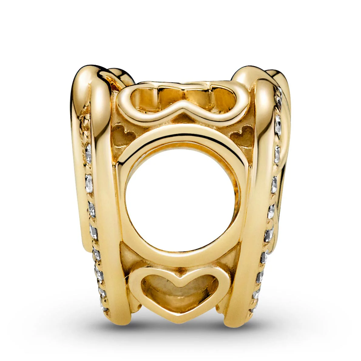 This Sparkling Entwined Hearts Charm is the perfect gift for someone with a heart of gold. Hand-finished, this design includes intertwining polished 14k gold-plated hearts and sparkling stone-embellished hearts on the front and back. Entwined hearts also feature on the sides. Inspired by eternal love, present this detailed openwork charm to someone special.